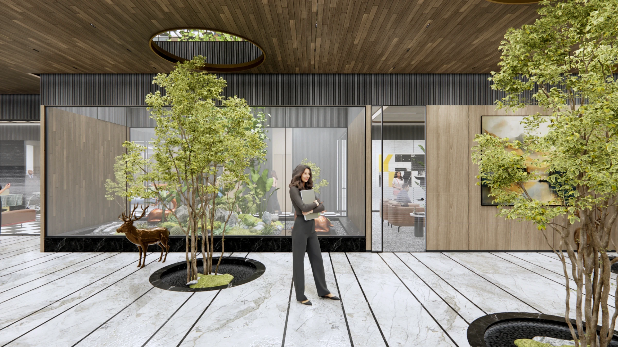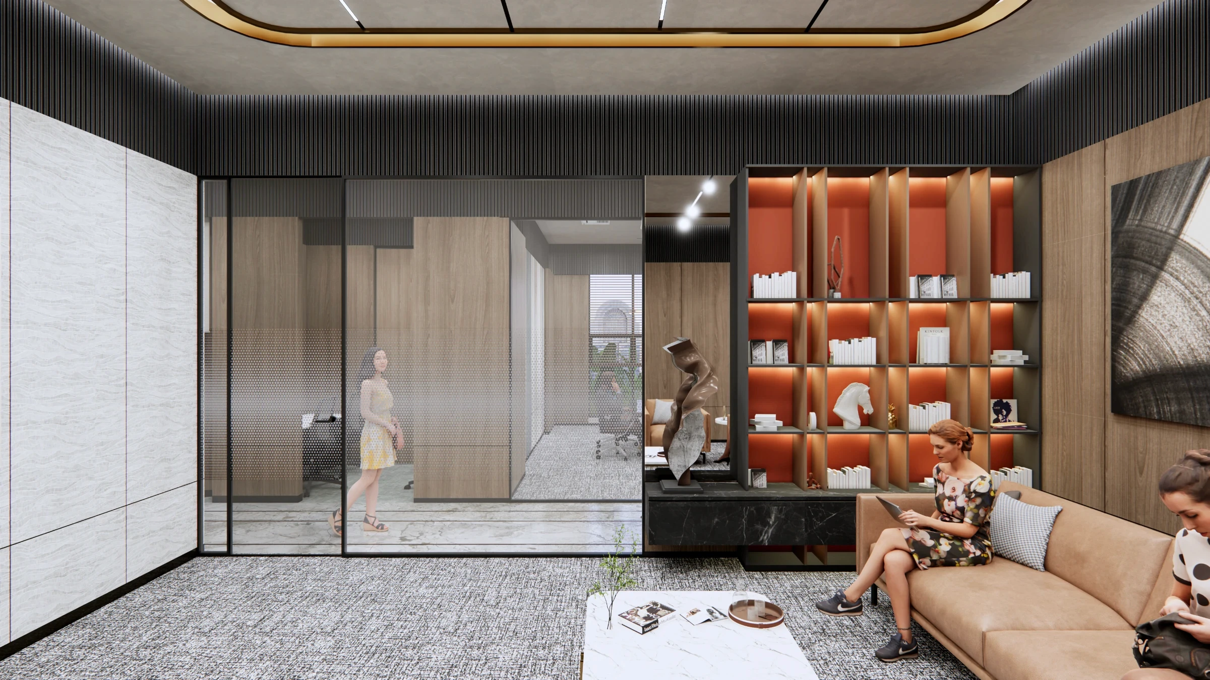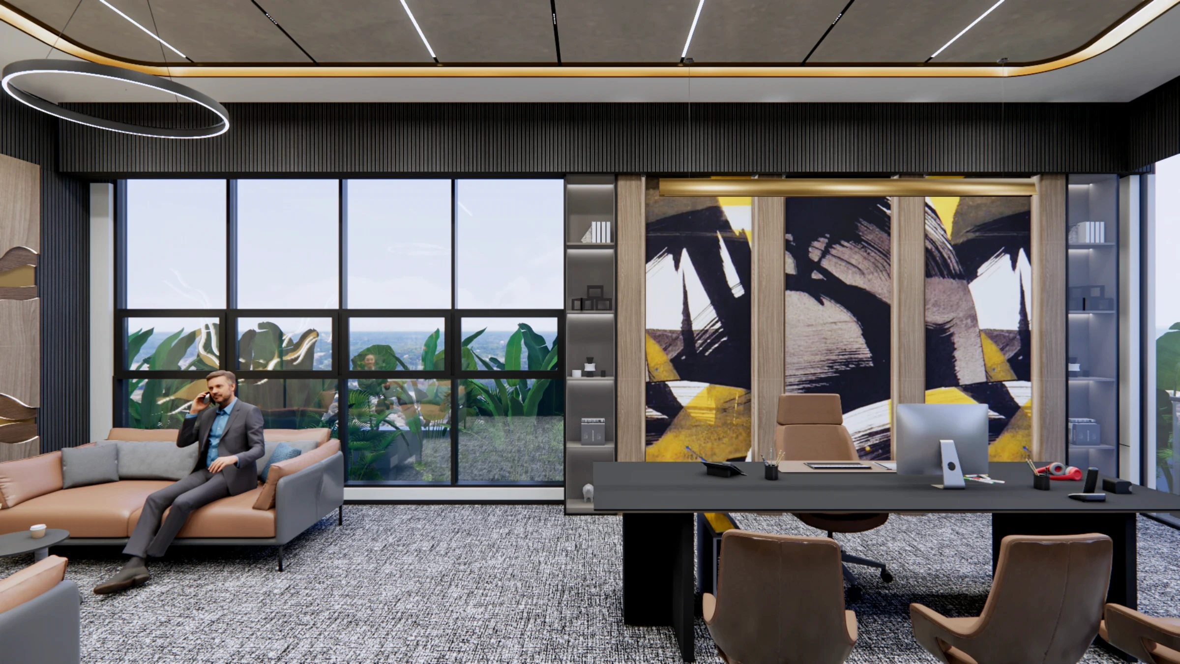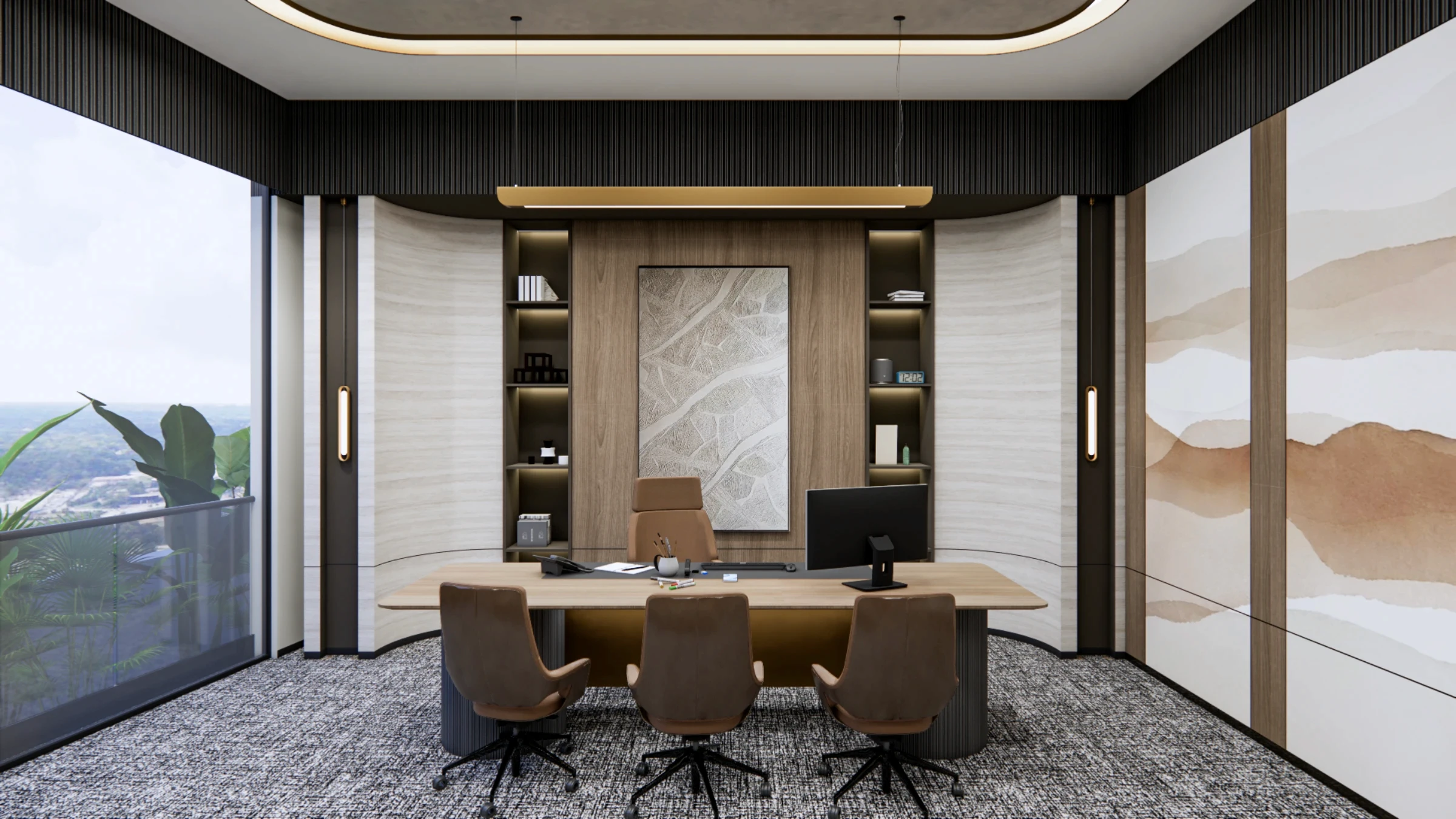 Luxurious, refined office for a high-end client, emphasizing discretion, timeless elegance, and quiet luxury.Elevated materials, meticulous detailing, and a restrained palette create a calm yet powerful environment. Spatial proportions and finishes are curated for privacy, focus, meetings, and executive use, with layered lighting and subtle textures adding depth and warmth.The result is a sophisticated space that blends comfort, exclusivity, and performance.